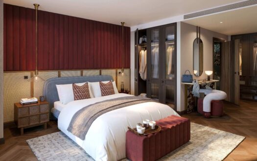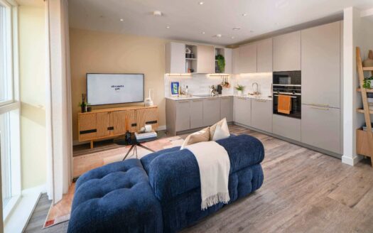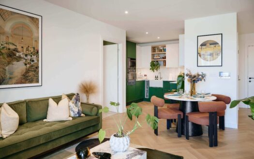The apartment features an open-plan living area with timber-effect flooring, a modern fitt ...